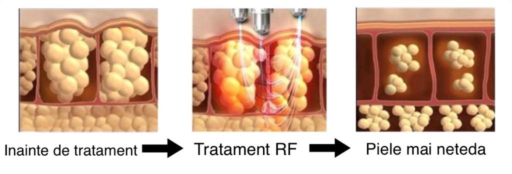 Terapia cu radiofrecventa are la baza incalzirea tesutului cutanat si adipos prin aplicarea de unde electromagnetice. Tesutul subcutanat se incalzeste pana la temperaturi de 60-65 de grade, avand loc in acest fel pe langa scurtarea fibrelor de colagen si stimularea secretiei fibrobastelor de noi fibre de colagenn si elastina. Contractia fibrelor de colagen duce si la spargerea si restrangerea celulele adipoase, ajutand zona tratata sa devina mai supla. Actiunea radiofrecventei se resimte si dupa finalizarea tratamentului, efectul de netezire si de tonifiere asupra pielii fiind continuu.